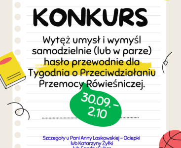 Zapisz na kartce wielkości A5 (wielkość kartki od zeszytu) swój slogan reklamowy, podpisz imieniem, nazwiskiem i klasą, a następnie przynieś ją do biblioteki lub gabinetu pedagoga szkolnego (obok sekretariatu). Masz czas do czwartku, 2 października 2025r. do 15.00! WYDŁUŻAMY TERMIN DO 7 PAŹDZIERNIKA (WTOREK) do godziny 9.00